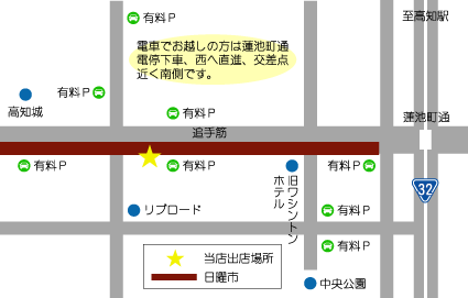 中田遊亀商店 日曜市店へのアクセス「高知の日曜市」は毎週日曜日(正月三が日以外)に、高知市追手筋で開催されている、土佐の街路市の中では最も大規模な市です。近くには「高知城」や「はりまや橋」などの観光スポットも多くあります。
